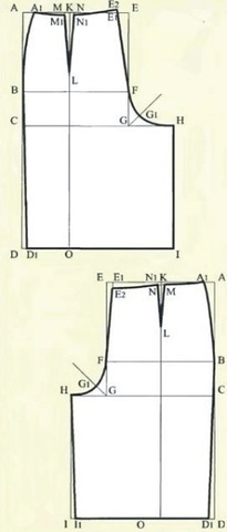 Проводим линию низа изделия по точкам D1 I1 и боковую линию по точкам А1В D1.