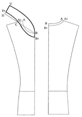 Проводим прямую через точки С и В. CD = 9 см (новая длина горловины спинки).